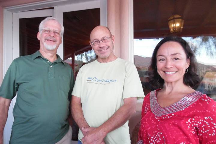 Robert Riemer, left, and Rachel Howland visited with Chautauqua scholar Doug Mishler on Friday during a reception prior to his performance as Ernie Pyle for Boulder City Chautauqua.