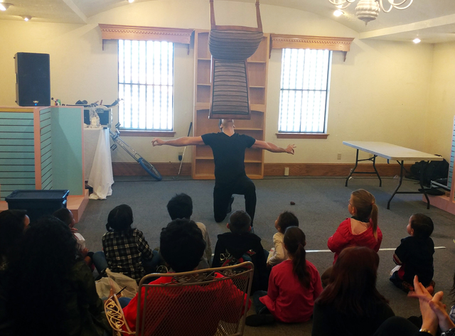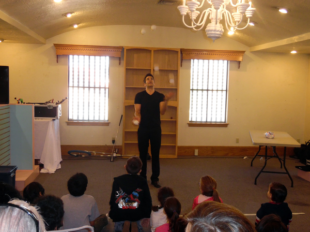 Civillico kept the children engaged with physical comedy, off-the-cuff jokes and audience participation, and he wowed them by balancing objects, including a chair and a table, on his chin. For the main attraction he juggled a variety of props, from bags, bowling pins and bowling balls to oversized knives, at one point even doing so atop a unicycle.
