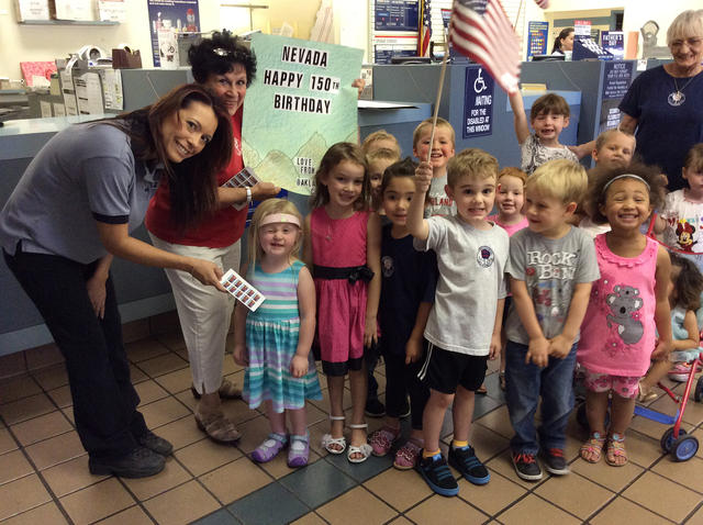 Students from Oaklane Academy preschool visited the Boulder City post office Friday morning to be among the first people to purchase the new stamp commemorating the 150th anniversary of Nevada’s statehood. The stamp was unveiled Thursday. Diane Trejo, far left, lead clerk at the post office, presents the stamps to Cora West, who was joined by teachers Carole Gordon, at left, and Cheryl Kern, far right, as well as fellow students Shayne Rieskamp, in pink dress, Jade Rivera, in blue shirt, and Devlin Shane, holding the flag.