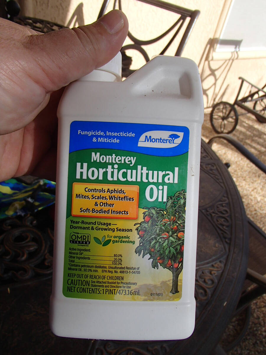 The dormant or horticultural oil is sprayed on the entire plant, top to bottom, after leaves have dropped and it has been pruned. Spray on a warm winter day with no wind. These types of oils are used for controlling outbreaks of soft-bodied insects like aphids, scale insects, mites and whiteflies. It does not control that crazy looking leaf footed plant bug or grubs feeding on roots in the soil. But, like many “organic” sprays, it is an indiscriminate killer; both good guys are bad guys are killed.