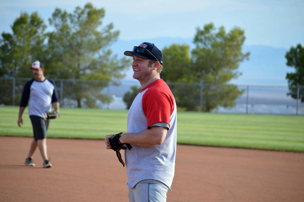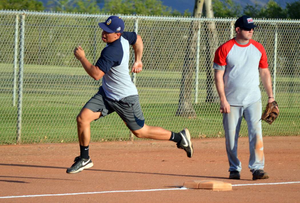 Justin Clift smiles after reaching first base during the softball game pitting Boulder City Police and Fire personnel against Boulder City High School alumni at National Night Out.
