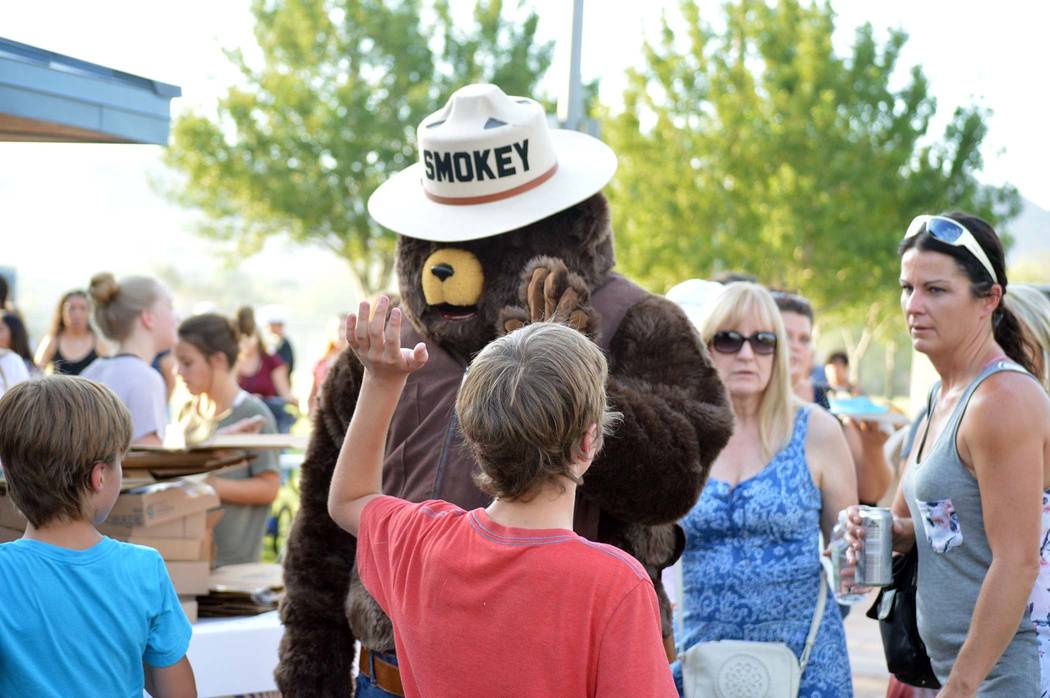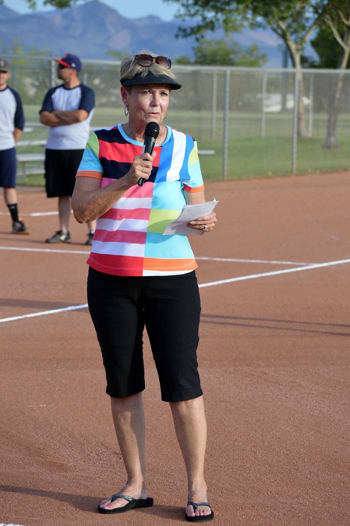 Councilwoman Peggy Leavitt welcomes people to National Night Out festivities and tells everyone it’s time to play ball.