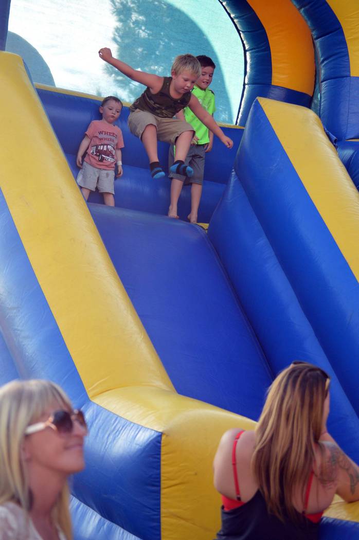 Five-year-old Gunner Gallup jumps down the inflatable slide Tuesday evening during National Night Out at Veterans’ Memorial Park.
