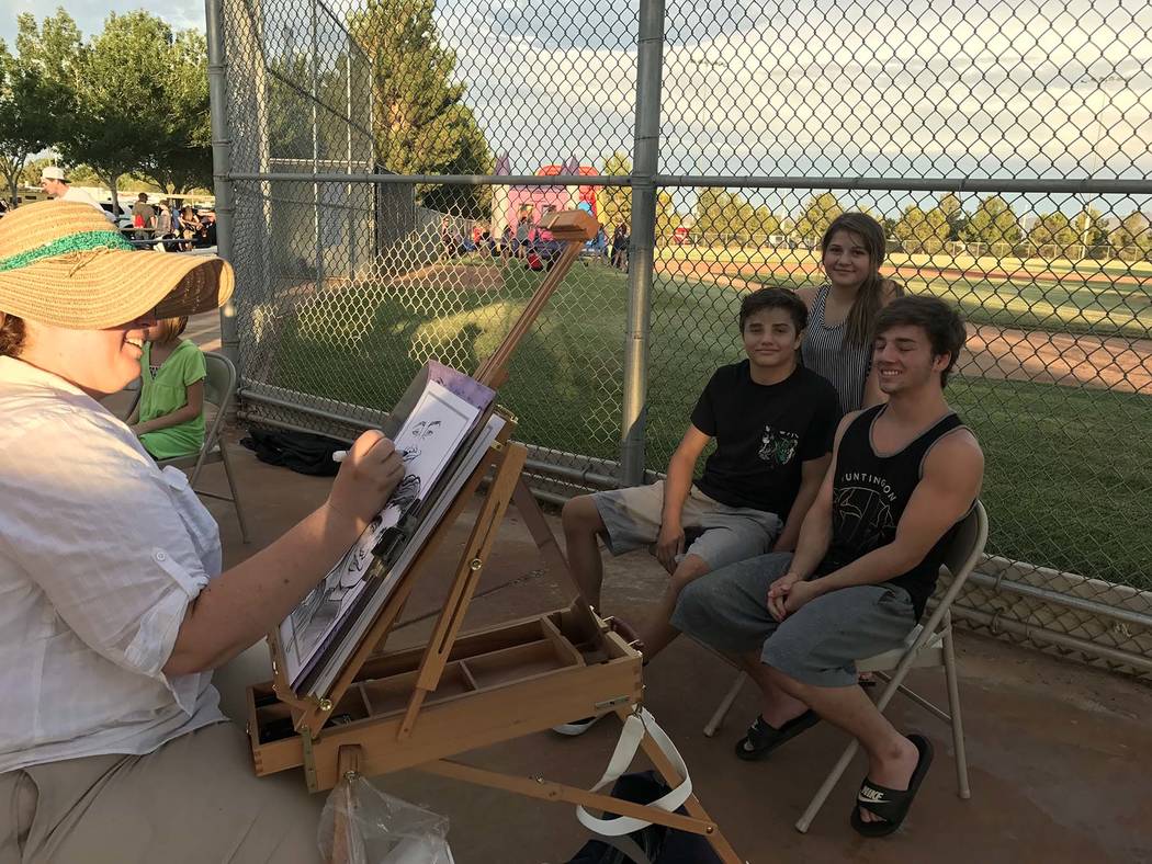 Celestia Ward, left, draws a caricature of siblings, from left, Skyler, Lexie and Tanner Hunt, who were visiting from Colorado and attended National Night Out on Tuesday in Veterans’ Memorial Park. Their father, Paul Hunt, was a wrestling champion for Boulder City High School.