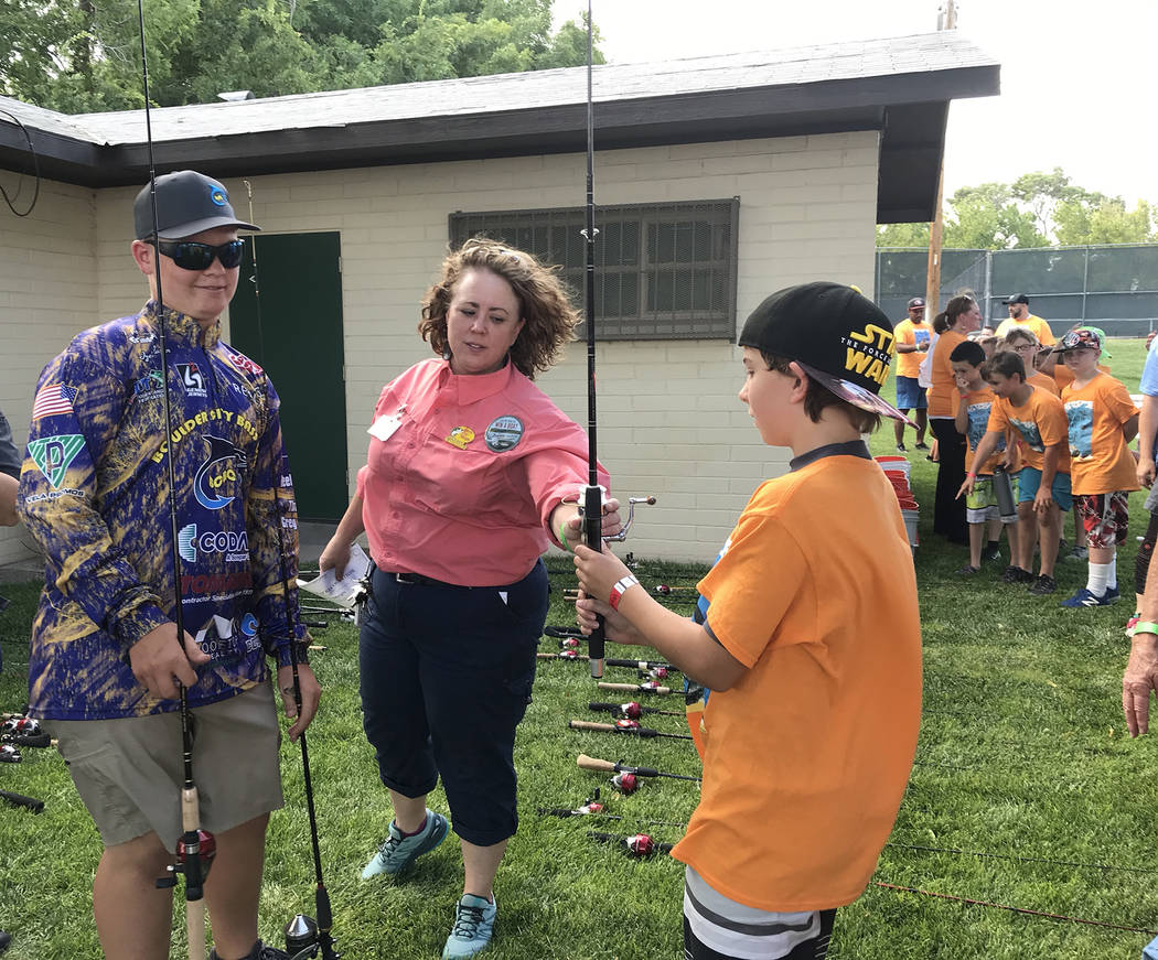 Corey Williams, left, president of the Boulder City Bass Club, assists Maureen Jones, special events lead for Bass Pro Shop in Las Vegas, as the sporting goods store donated about 80 fishing poles to Boy Scouts participating in the annual summer day camp Thursday, June 6, at Broadbent Park. The poles were refurbished by Bass Pro after they were donated by customers during a turn-in program. Each rod was paired with a reel. The company has donated more than 55,000 rods and reels nationwide in an effort to promote the health benefits of getting outside and away from electronic devices.