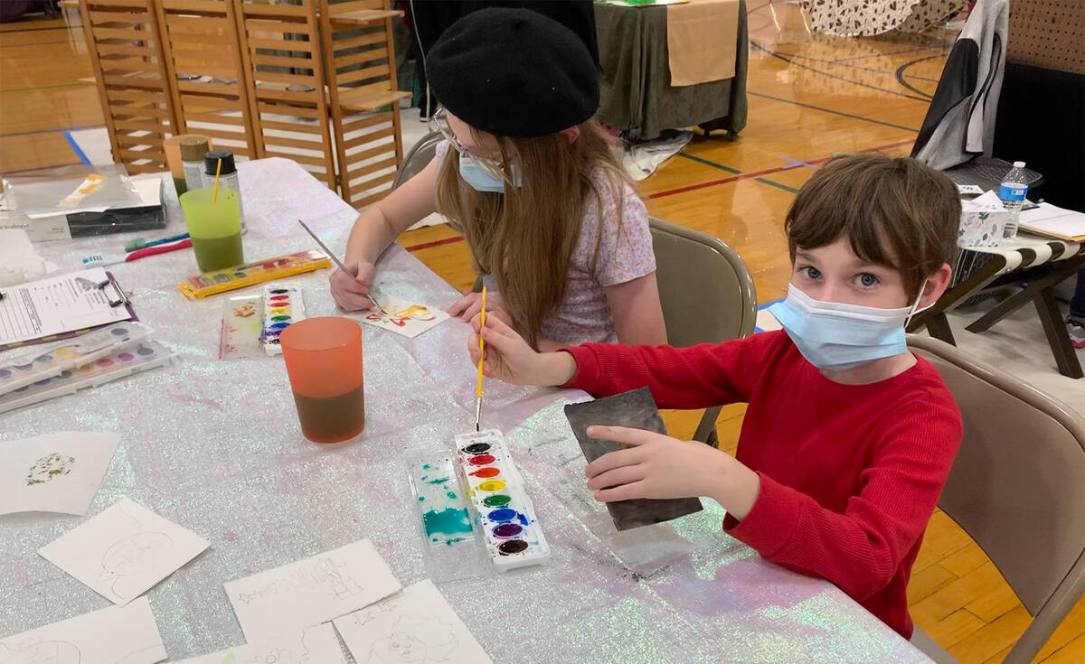 Abi, left, and Joseph Brewer made their own Christmas cards at one of the booths at Boulder City Art Guild’s Artists in Action holiday show Saturday, Nov. 13, at the Boulder City Recreation Center.