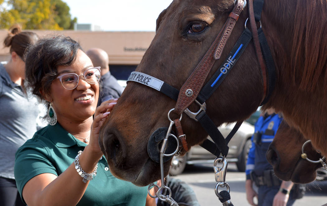 Dasia Cobb pets Odie during Cops, K-9s and Coffee at the Boulder Dam Credit Union on Friday, March 6. Cobb said it was the first time she petted a horse. She works at the credit union in card services.