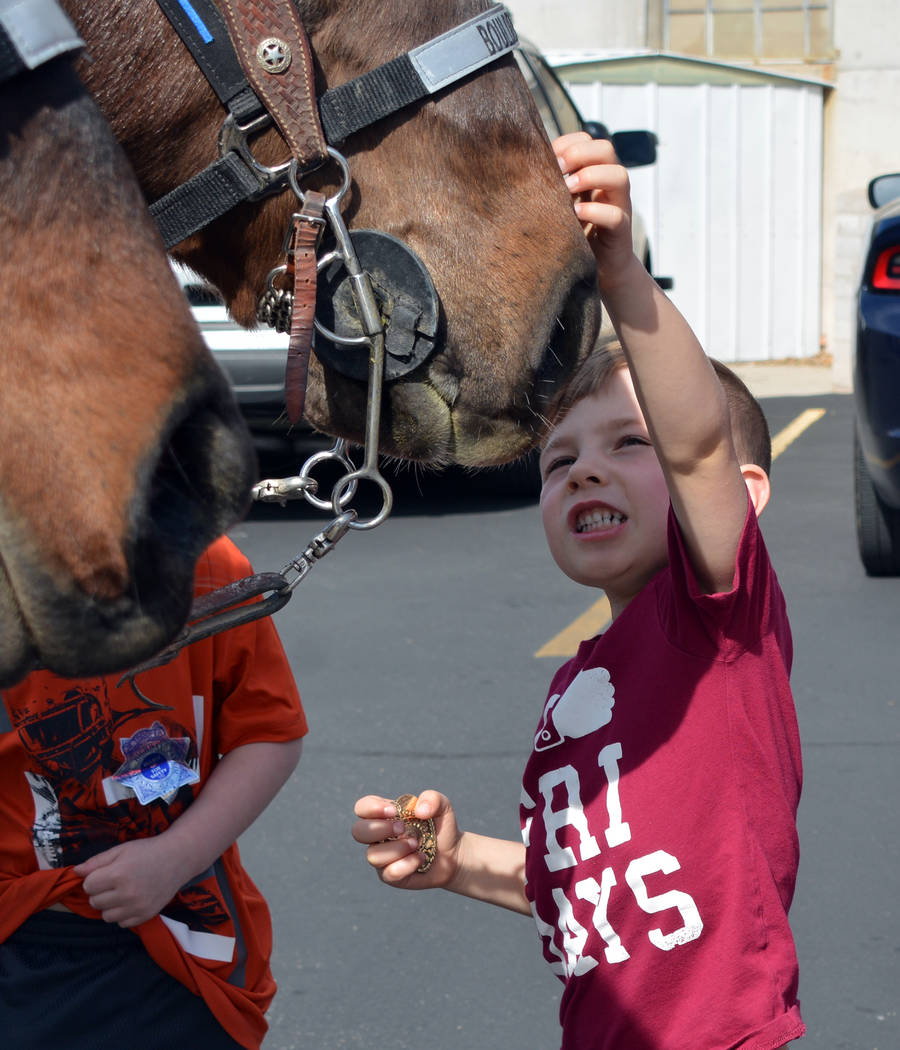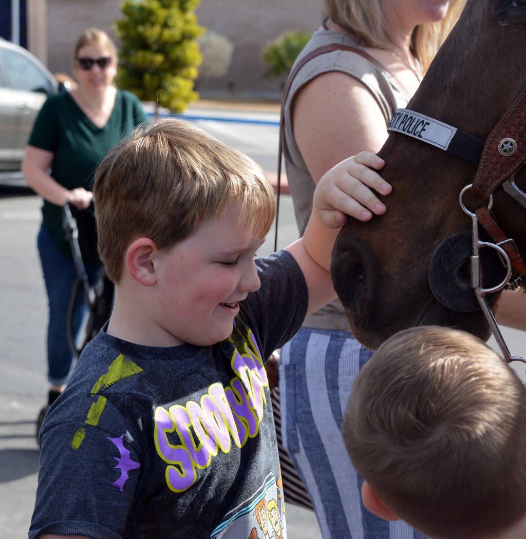 Jackson Mack pets Star, a horse with the Boulder City Police Department Mounted Unit, at Cops, K-9s and Coffee on Friday, March 6, at the Boulder Dam Credit Union.