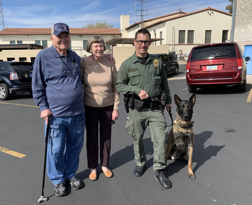 Todd Austin, right, a K-9 officer with the National Park Service, introduced his new partner, Mach, to Fred and Johanna Eltrick of Boulder City at Friday’s, March 6, Cops, K-9s and Coffee event at Boulder Dam Credit Union. Austin said Mach, named for his speed, is a 3-year-old Belgian Malinois that just finished training.