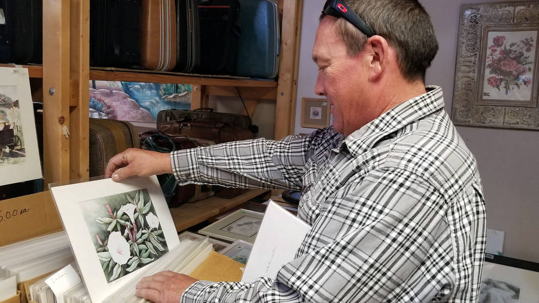 Jimbo Zinn looks through pieces of art done by the late Eleanor Beckert at the annual Country Store on Friday, Oct. 18, during the fundraiser put on by Grace Community Church. Beckert’s family donated a lot of her art collection to the sale.