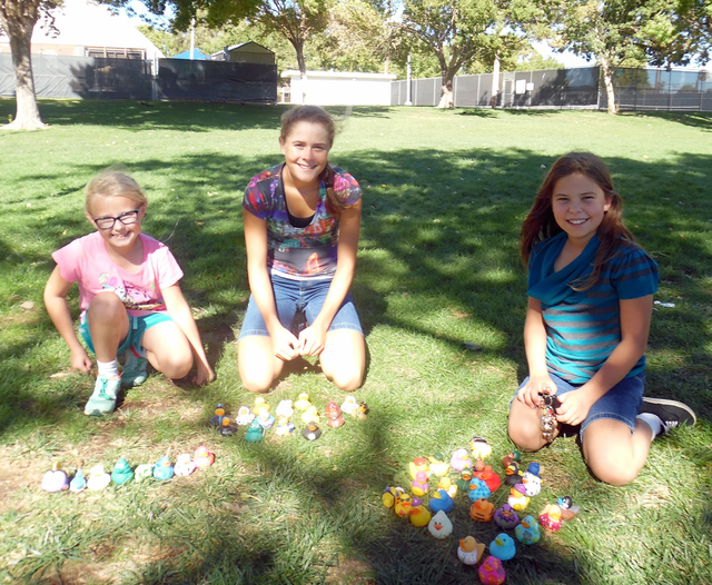 Emily Traasdahl, 8, from left, Olivia Mikkelson, 14, and Lillian Mikkelson, 10, took home a bounty of aquatic prizes after playing games at Dr. Eldon Clothier’s thank you picnic Saturday in Broadbent Park marking Advanced Dental Care’s 40th anniversary in Boulder City.