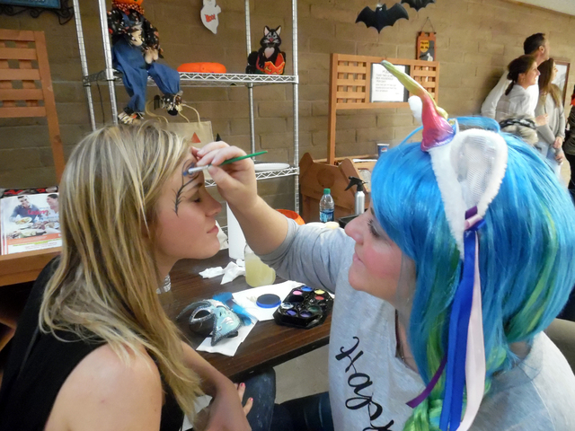 Sara Hoffman of Las Vegas has her face painted by Kristen Byers of Boulder City on Friday at Family Fun Night, hosted by the Senior Center of Boulder City.