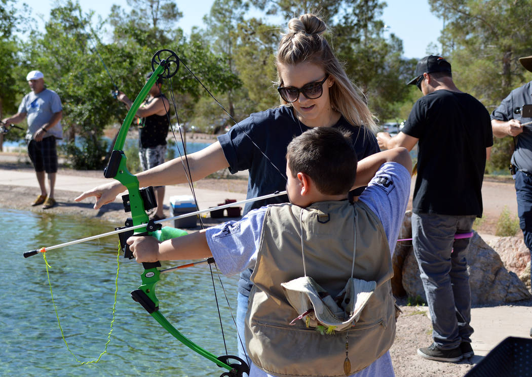 Holly Brisendine of the Nevada Department of Wildlife helps 7-year-old Aiden Watts learn how to bowfish at Free Fishing Day on Saturday, June 8, at Veterans’ Memorial Park in Boulder City.