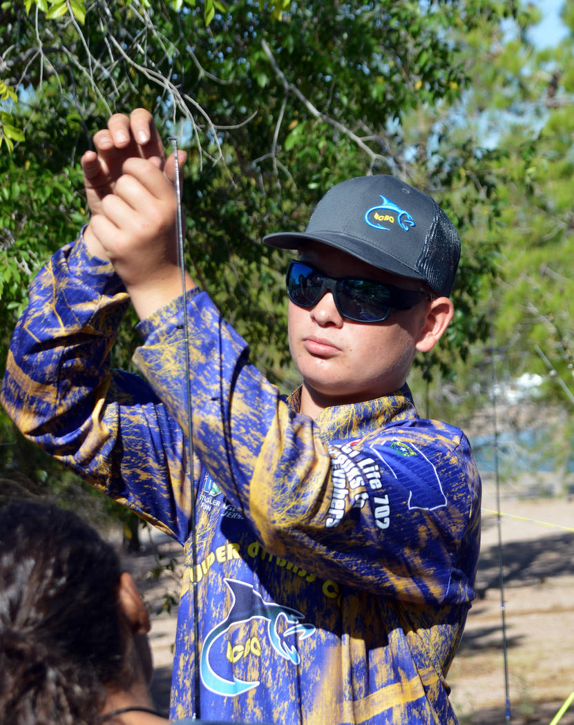 Izec Easter, a member of Boulder City Bass Club, helps attendees at Free Fishing Day prepare their free fishing poles. Bass Pro Shops donated rods and reels for the event.