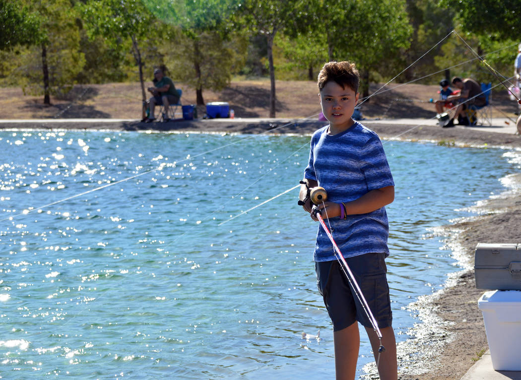 Twelve-year-old Thomas Friesz casts off at his first Free Fishing Day at Veterans’ Memorial Park in Boulder City on Saturday, June 8.
