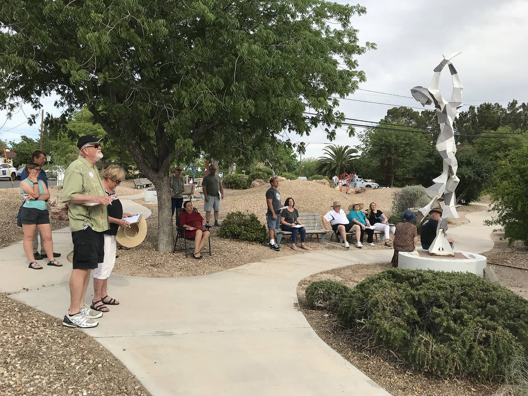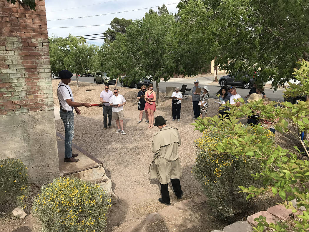 A group listens for clues as Boulder City History & Arts Foundation presented “Gun Crazy,” a murder mystery based on historical events, on Saturday, April 27, at the old water filtration plant on Railroad Avenue.