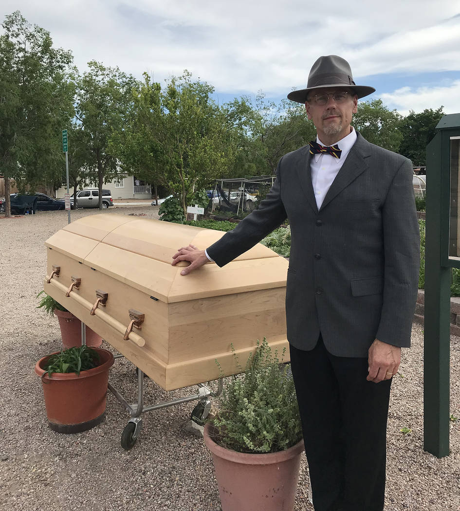 Ray White, author of “Gun Crazy,” a murder mystery presented by the Boulder City History & Arts Foundation on Saturday, April 27, at the old water filtration plant, stands near a coffin prop, lent to the group by Boulder City Family Morturary, while he awaits the next group of audience members to wrap up the tale.