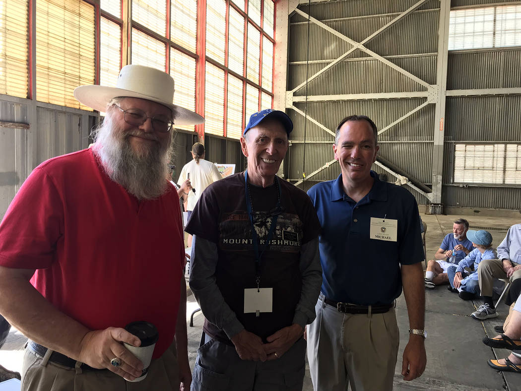 Mark Hall-Patton, left, administrator for the Clark County Museum system, is joined by Charlie Hauntz, center, a member of Boulder City’s Historic Preservation Committee, and Michael Mays, the city’s community development director, in the old airport hangar at what was once Bullock Field prior to Hall-Patton’s presentation about aviation.