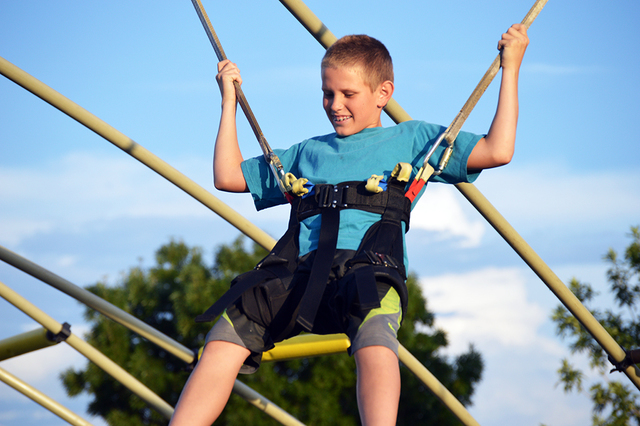 Joey Martin, 13, plays on the bungee jump during National Night Out on Tuesday at Veterans’ Memorial Park while his mother Laurell Martin watches. Martin said it was important for her kids to interact with law enforcement in a positive way. “These are people you run to,” Martin said. Max Lancaster/Boulder City Review