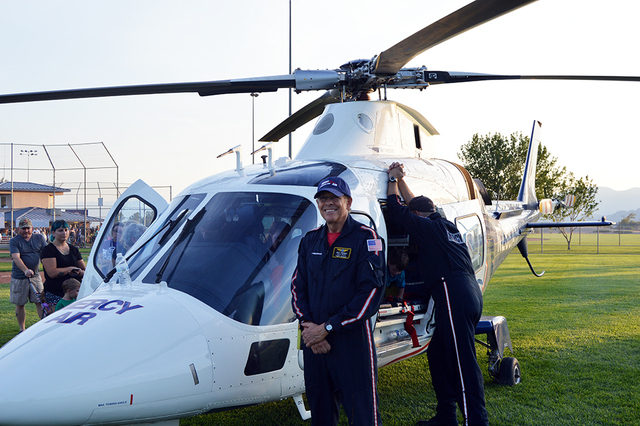 Mercy Air lead helicopter pilot Mike Siemers smiles in front of his rescue chopper during National Night Out. Kids at the event loved the helicopter and couldn’t wait to sit in the pilot’s seat. Max Lancaster/Boulder City Review