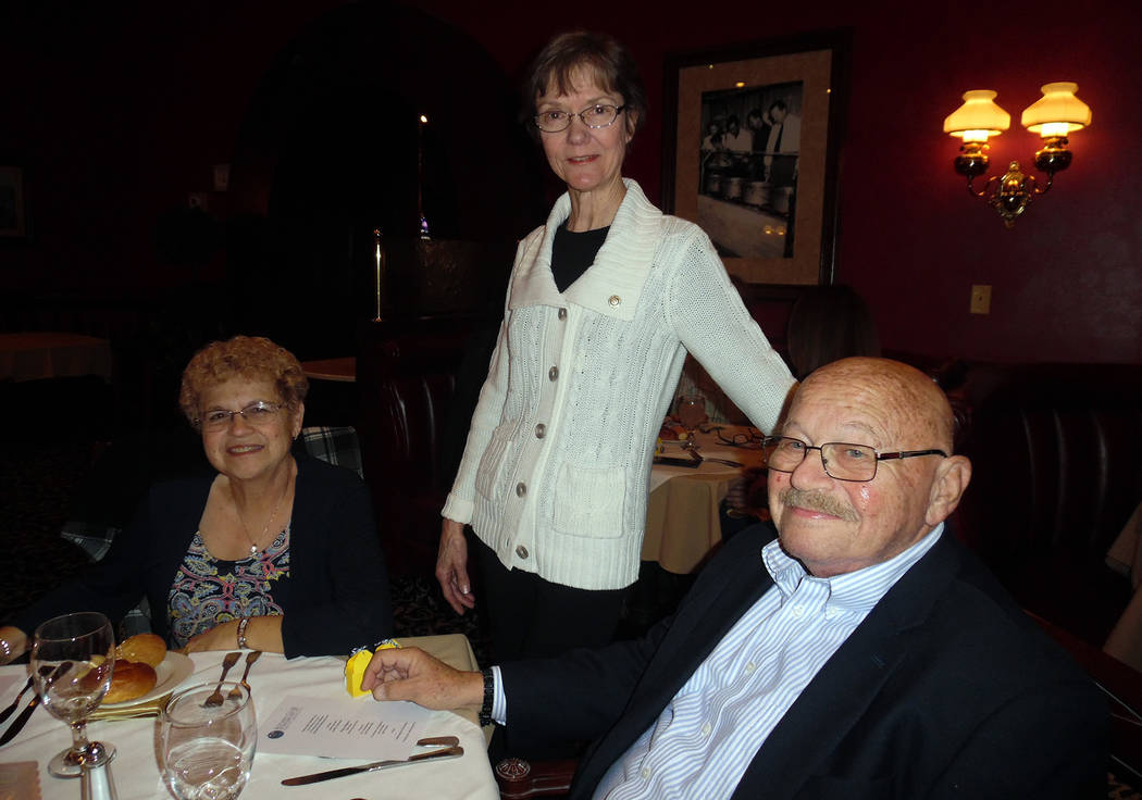 Rotary Club of Boulder City past president Lettie Zimmerman, standing, visits with Sharon and Gary Berger during the club’s 80th anniversary celebration Feb. 28 inside DeSimone’s Steakhouse at the Railroad Pass.
