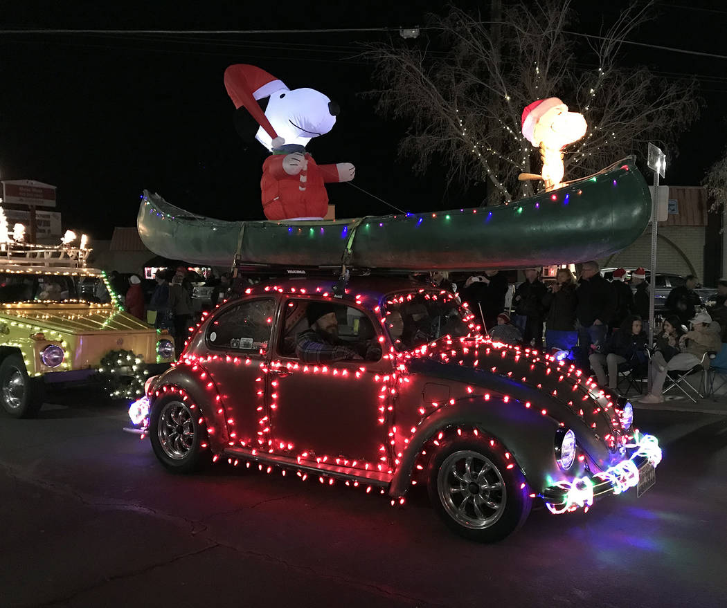 A Volkswagen Beetle is topped with Snoopy and Woodstock in a canoe was part of a group of vintage Volkswagens in Santa’s Electric Night Parade on Saturday, Dec. 1, 2018.