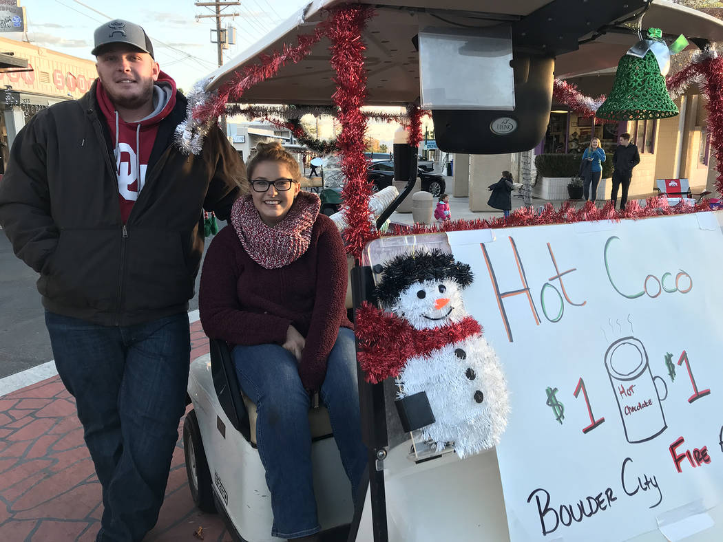 Helping keep parade watchers warm while raising funds for the Boulder City Fire Fighters Association by selling hot cocoa on Saturday, Dec. 1, 2018, were Wade Ray and Coral Leon.