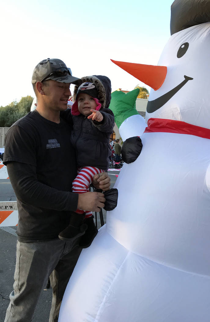 J.D. Owens entertains his 2-year-old daughter Braelynn Owens visiting an inflatable snowman before the start of Santa’s Electric Night Parade on Saturday, Dec. 1, 2018, in downtown Boulder City.