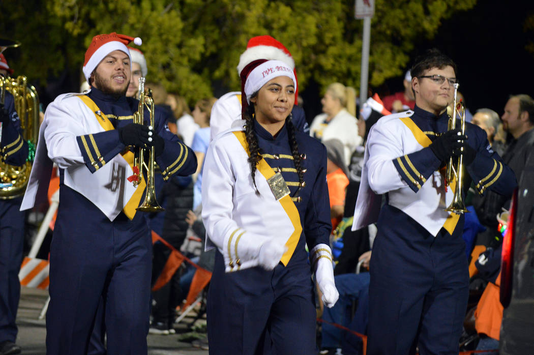 Boulder City High School Marching Band members, from left, Jesse Matuska, Gwynneth Miller and Weston Martin march in Santa’s Electric Night Parade on Saturday, Dec. 2.