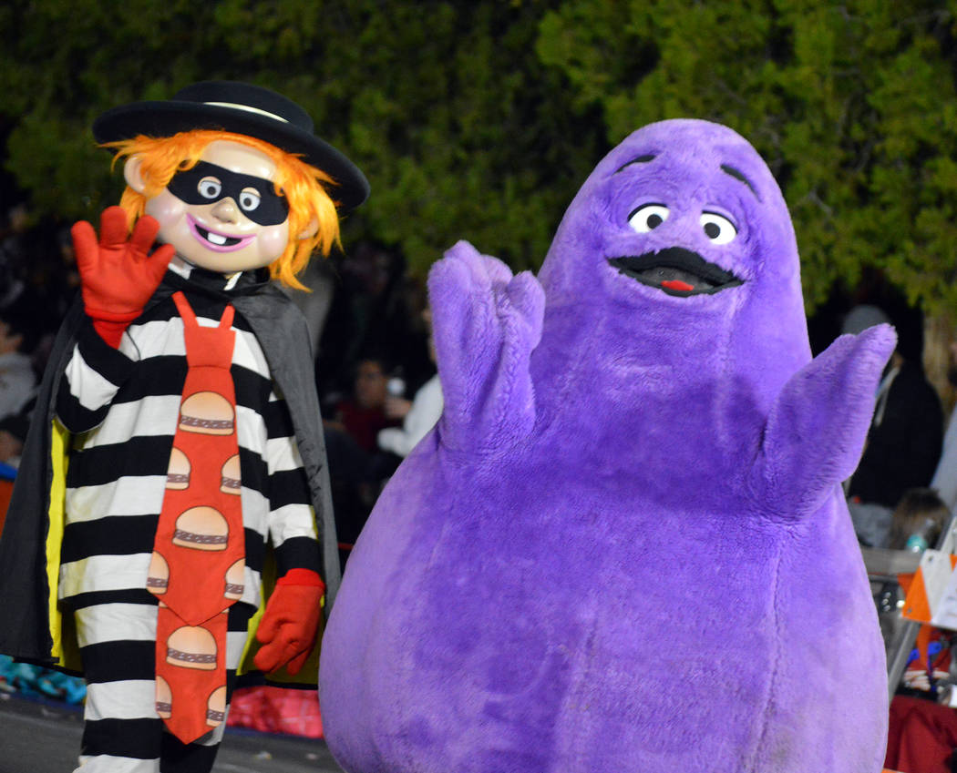 McDonald’s characters Hamburglar and Grimace wave to the crowd at Santa’s Electric Night Parade on Saturday, Dec. 2, in Boulder City.