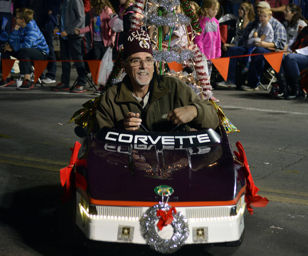 Zelzah Shriner and Boulder City resident Jim Giannosa zooms past the crowd in Santa’s Electric Night Parade on Saturday.