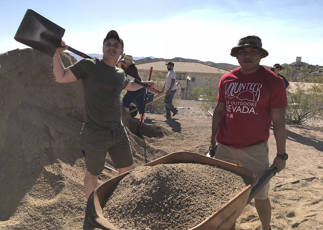 Gabriela Loredon, left, of Las Vegas, and Breanna Vreeland, daughter of St. Jude’s Ranch for Children’s executive director, were among those who volunteered on Saturday to help build a community garden. Volunteers created planters and filled them with enriched soil, filled in rock walkways and planted trees.