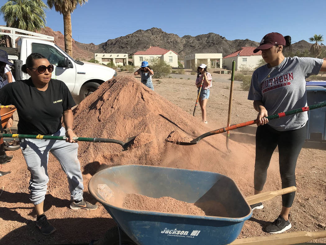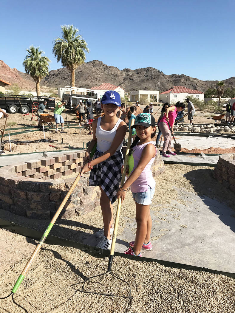 Volunteers of all ages, including Natielle, left, and Shylah Martinez of Las Vegas, came to St. Jude’s Ranch for Children in Boulder City on Saturday to help build a community garden.