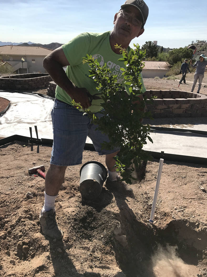 Brian Franklin, a senior therapeutic house director at St. Jude’s Ranch for Children, was among those helping build a community garden on the Boulder City campus Saturday. The garden will serve as a gathering spot, as well as teach children at the ranch about growing food.