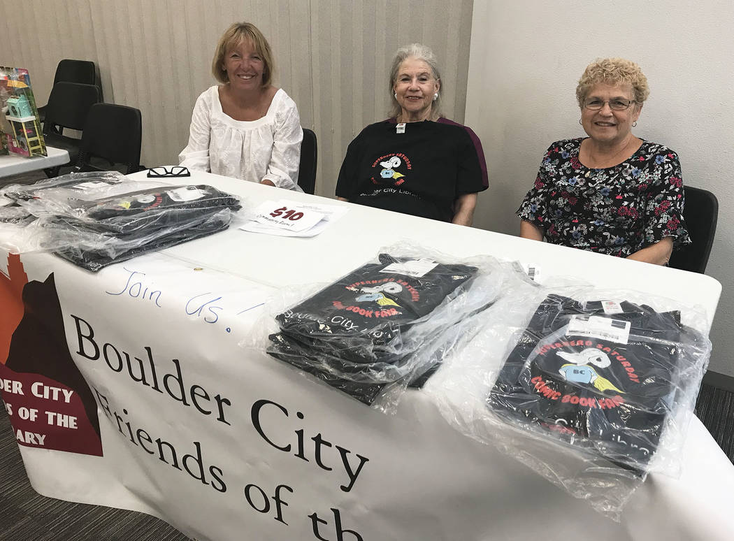 Boulder City Friends of the Library members, from left, Sharon Newby, Sharon Lazar and Sharon Berger, offered information about joining the group that supports the Boulder City Library and sold T-shirts during Superhero Saturday festivities at the library on Saturday, June 1, 2019.
