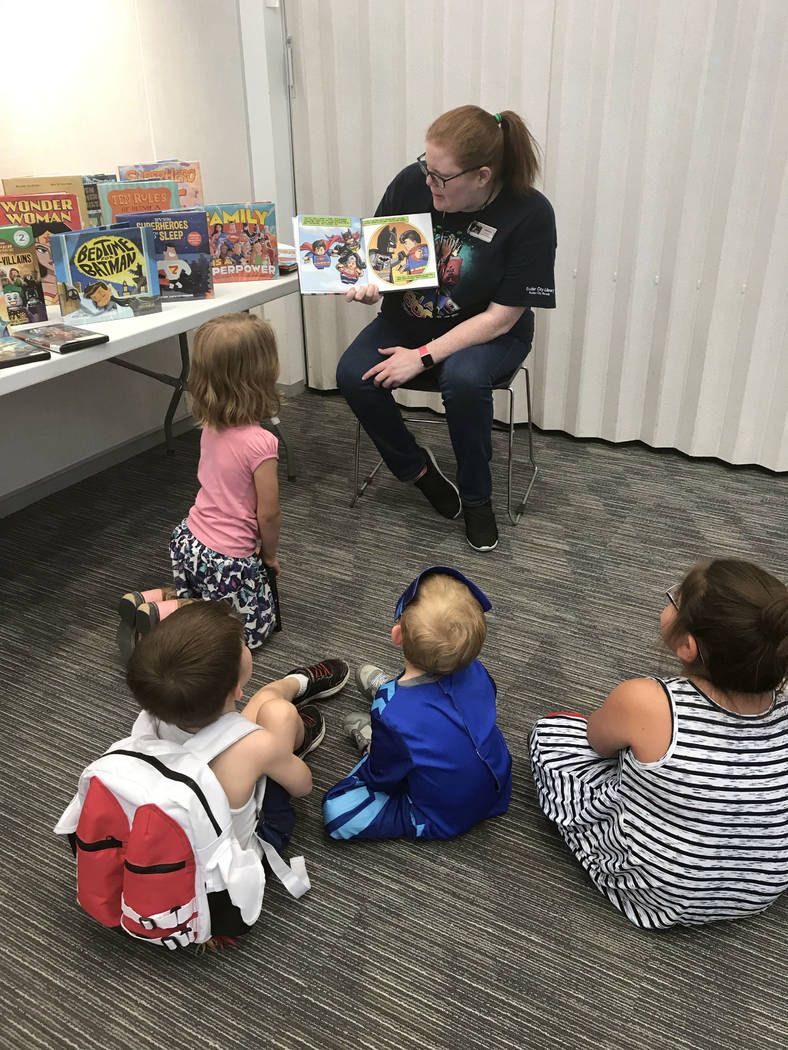 Jessica Jones, head of youth services at Boulder City Library, reads a story about heroes to children during Superhero Saturday festivities on Saturday, June 1, at the library.