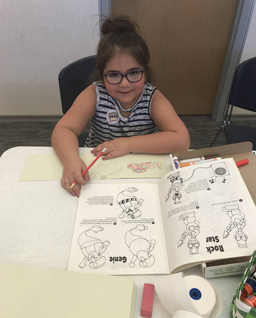 Leora Rose, 5, of Boulder City tries her hand at drawing a genie and other cartoon characters during Superhero Saturday at Boulder City Library on Saturday, June 1, 2019.