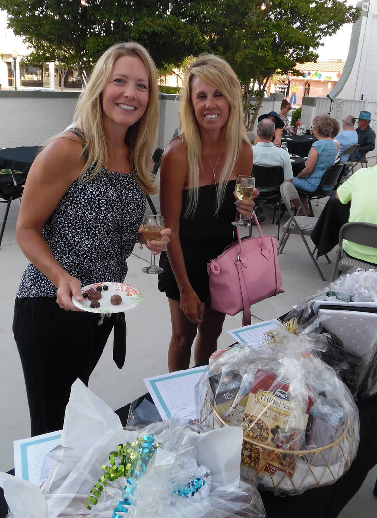 Natalie Cowdrey, left, and Julie Hill look over the silent auction baskets at Saturday’s chocolate and wine tasting event presented by the Boulder City branch of the American Association of University Women on the patio at the Boulder Dam Hotel. Proceeds from the event provide scholarships.