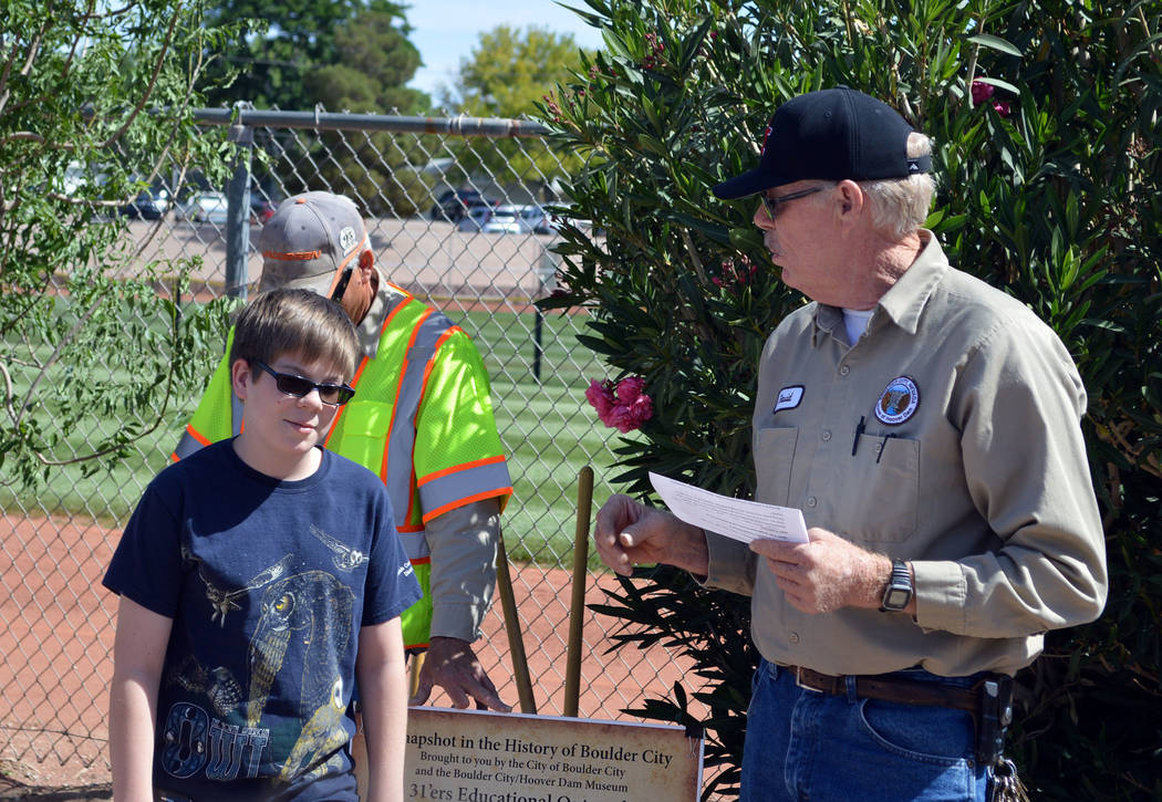 David Duncan of Boulder City’s landscape department quizzes his son, Mitchell Duncan, about Arbor Day.