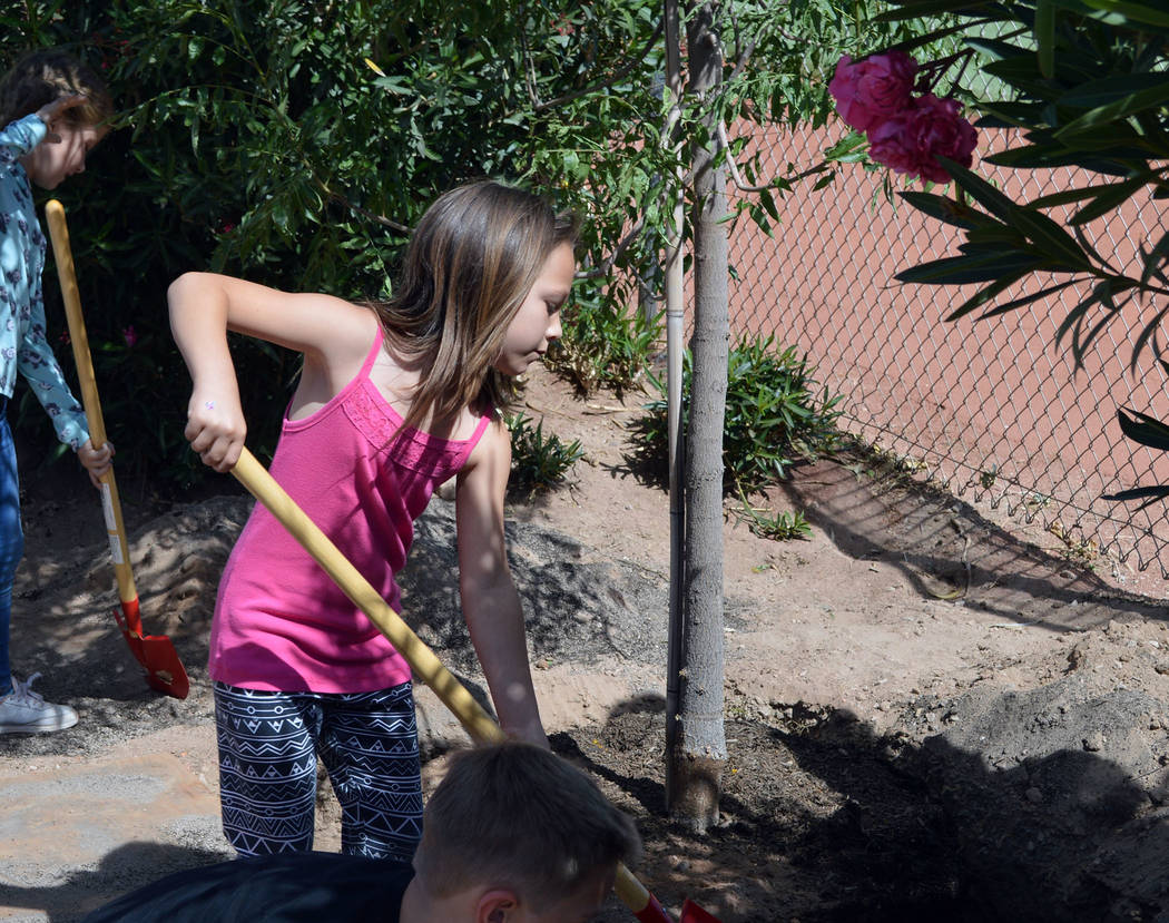 Maddie Grimes helps plant a tree outside the Boulder City High School softball field. Her older sister, Jessica, stands by ready to help.