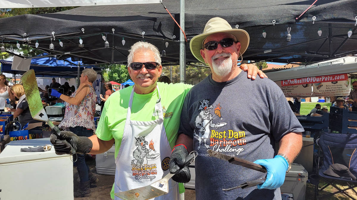 Dale Ryan, left, and Steve Parnes take a break from cooking at the Rotary Club of Boulder City’s grill Saturday, May 29. Ryan said they cooked more than 1,200 hamburgers and 300 hot dogs over the weekend.