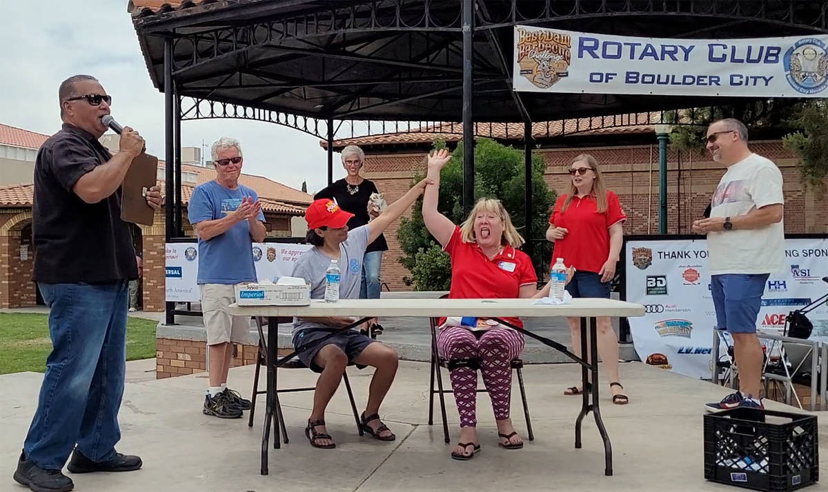 Rotary Club of Boulder City member Larry Archuleta, seated at left, congratulates Sunrise Rotary Club member Dawn Green, seated at right, on her victory in the rib eating contest Saturday, May 29, at the Best Dam Barbecue Challenge in Boulder City.
