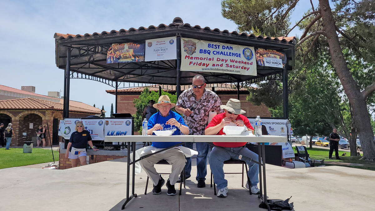 Nevada State Sen. Joe Hardy, left, battles it out with Boulder City Mayor Kiernan McManus, right, in the rib eating contest Saturday, May 28, during the Best Dam Barbecue Challenge while master of ceremonies Mike Pacini, center, provides play-by-play commentary for the audience.
