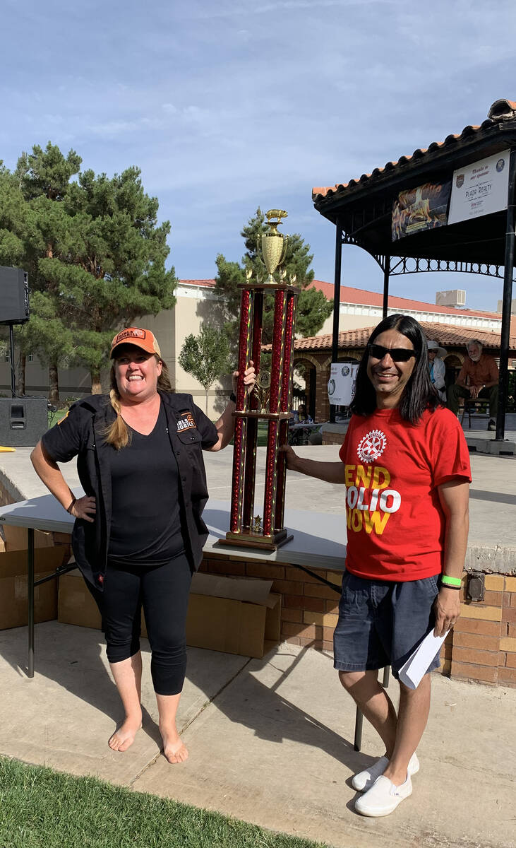 Christie Vanover, left, of Girls Can Grill accepts the grand champion trophy after winning the top award at the Rotary Club of Boulder City’s Best Dam Barbecue Challenge on Saturday, May 28. Larry Archuleta, past president of the club and event chairman, presented the trophy.