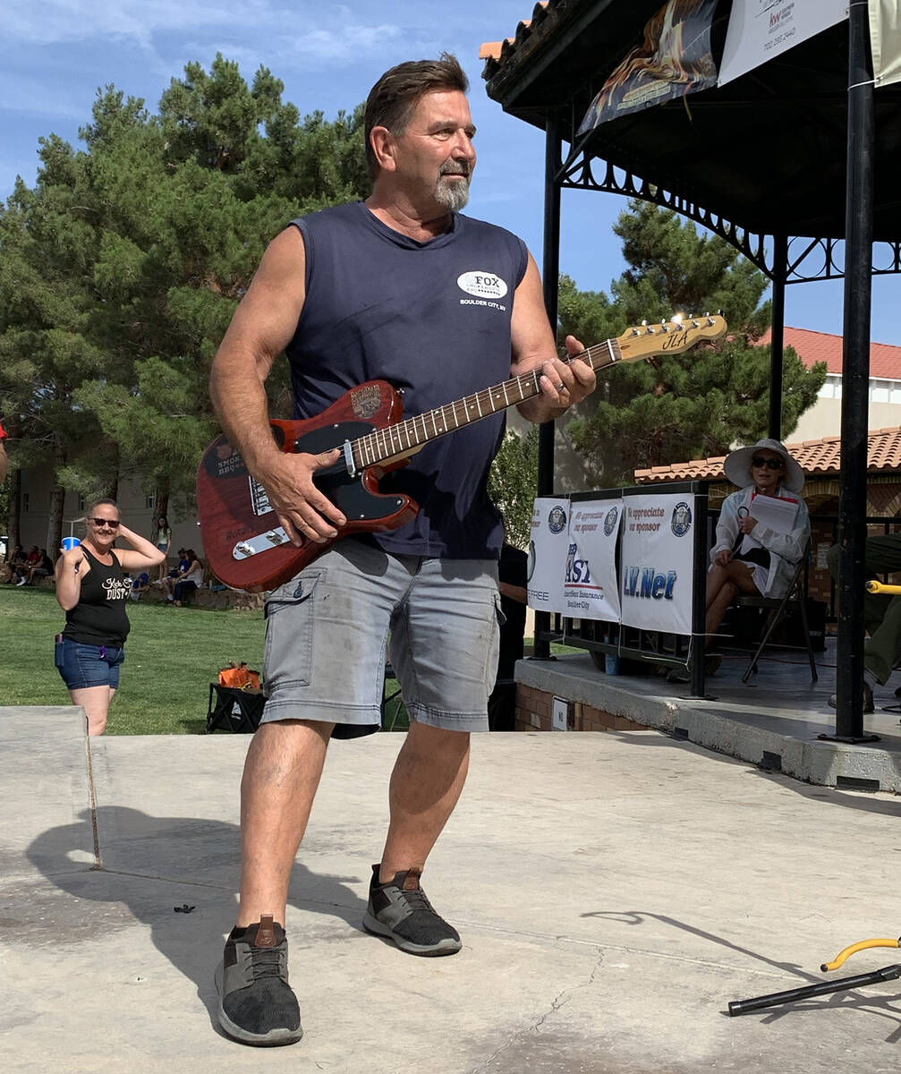 Dan Fox of Fox Smokehouse BBQ tests out the custom guitar he was presented Saturday, May 28, 2022, for his support of the Rotary Club of Boulder City’s Best Dam Barbecue Festival. His barbecue restaurant provides ribs for the event’s rib eating contest. Additionally, he has been a sponsor and provided food for a barbecue judges class.