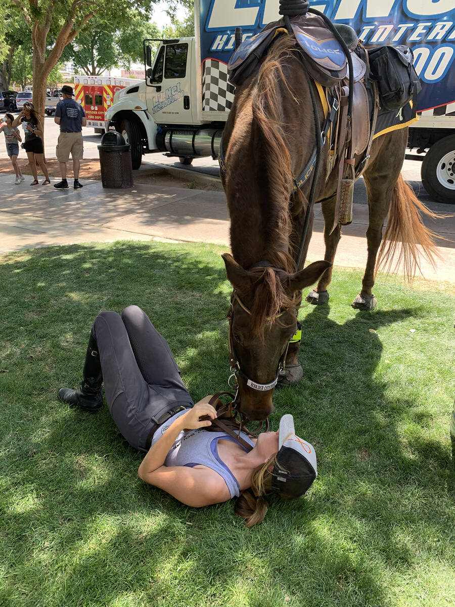 Emma Ford shares a quiet moment with Odie, who was recently retired from Boulder City Police Department’s mounted unit, during the Best Dam Barbecue Challenge in downtown Boulder City on Saturday, May 28.