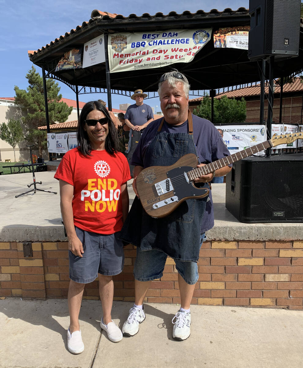 Larry Archuleta, past president of the Rotary Club of Boulder City, presented a custom guitar he made to Rik Eide of Great Basin Barbecue for Eide’s long-time support of the Best Dam Barbecue Challenge. Eide, a past president of the Rotary club in Moapa Valley, has been a concessionaire at the festival since it began.
