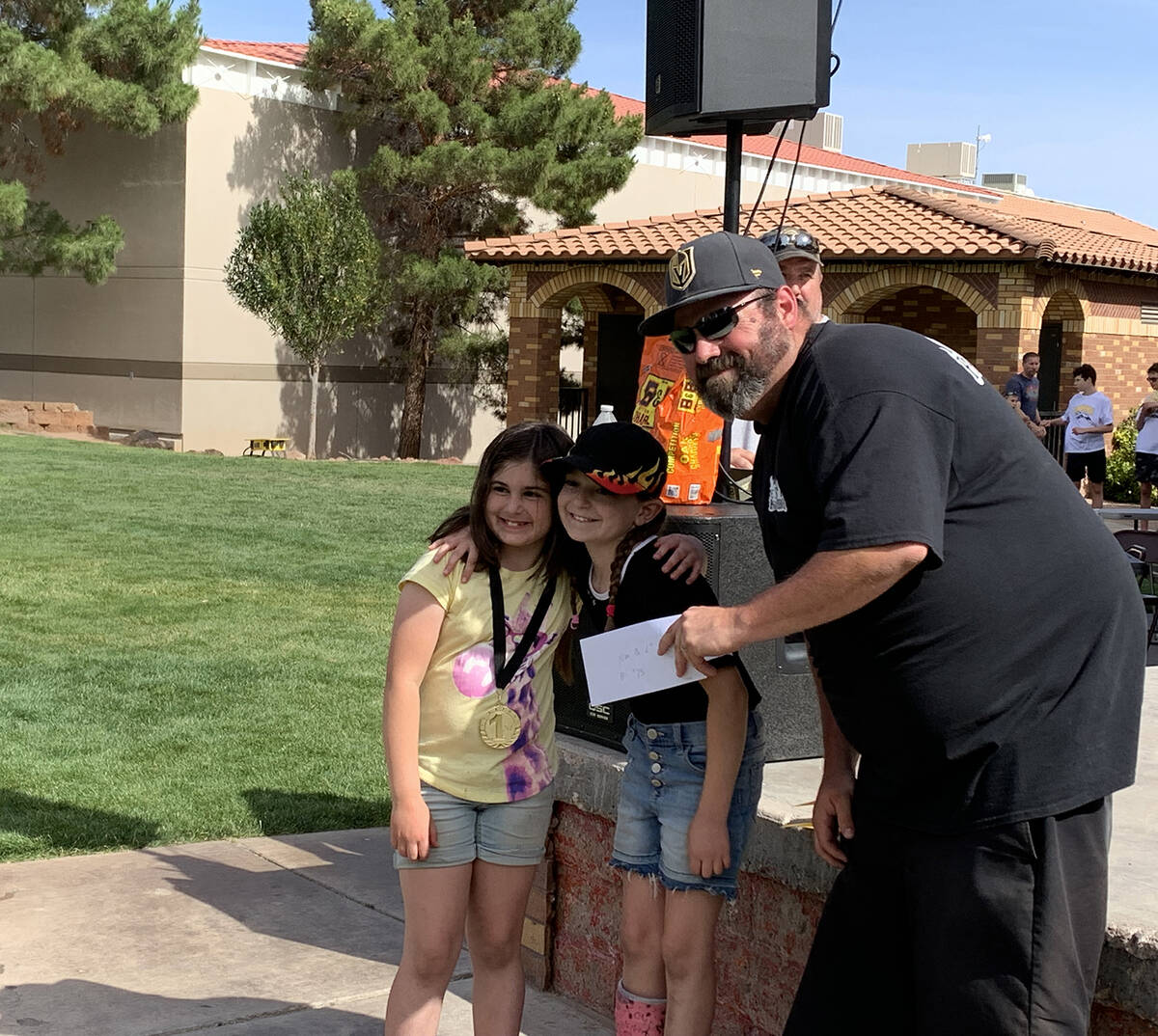 Steve Roy, right, president of the Nevada Barbecue Association, congratulates Abigail Hoffman, left, and Kaitlin Hoffman, who won the 6-12 age division of the KidsQue Challenge on Saturday, May 28, at the Best Dam Barbecue Challenge presented by the Rotary Club of Boulder City. The Nevada Barbecue Association helped sponsor and run the cooking contest for children.