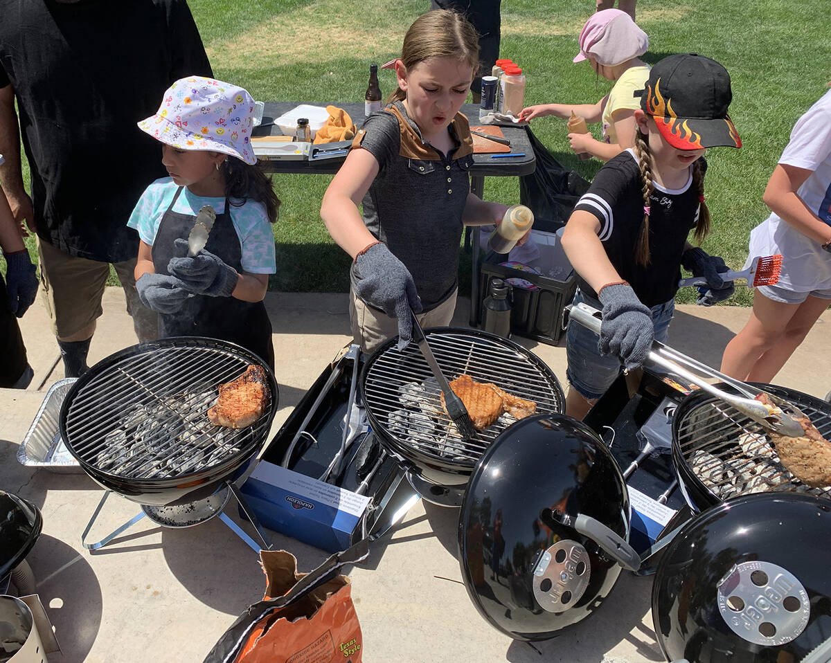 Wendy Higuera, 8, from left, Samatha Hoffman, 11, and Kaitlin Hoffman, 10, cook pork chops during the KidsQue Challenge during the Best Dam Barbecue Challenge in Bicentennial Park on Saturday, May 28, 2022. Kaitlin, along with her sister Abigail Hoffman, 8, in the pink hat in the back, won first place in the 6-12 age division and scored the highest overall among all the 15 competitors.