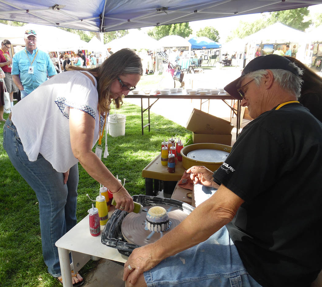 Shelly Thornhill of Las Vegas creates a spinner bowl as Craig Corey, who teaches ceramics at the Boulder City Parks and Recreation Department’s art center, keeps the pottery wheel in action at Saturday’s Spring ArtFest presented by the Boulder City Art Guild in Bicentennial Park.